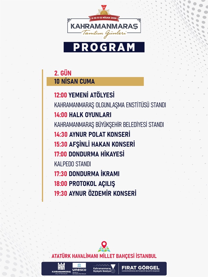 Şehrin gastronomisi, geleneksel el sanatları ve kültürünü ulusal ve uluslararası ziyaretçilere tanıtmak için İstanbul Atatürk Havalimanı Millet Bahçesi’nde gerçekleştirilen “Kahramanmaraş Tanıtım Günleri”nin ikinci günü, gerçekleştirilecek çeşitli etkinliklerle devam edecek.